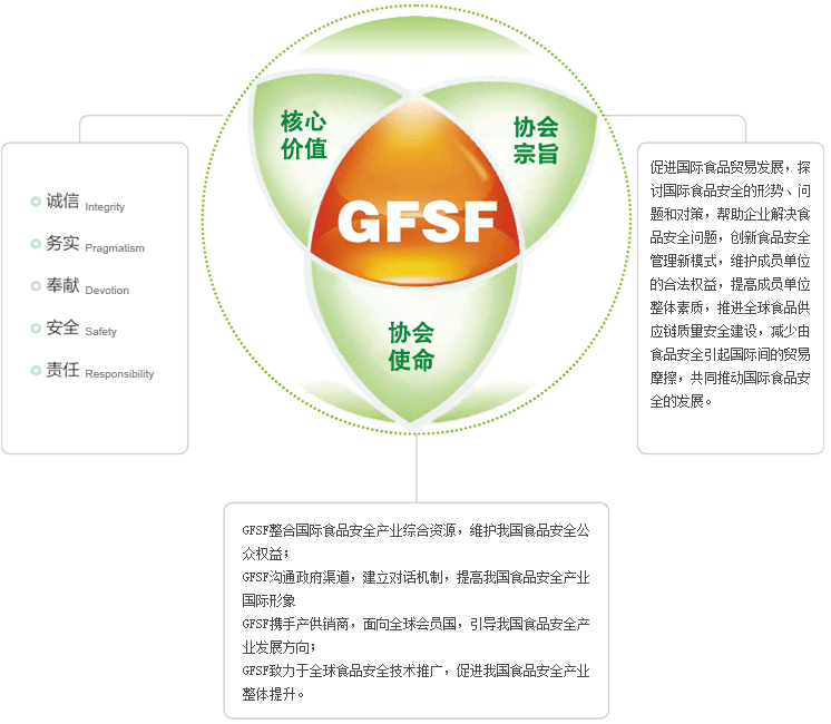 国际食品安全协会(Global Food Safety Forum, GFSF)是在美国注册成立的非营利性食品及相关行业公益性社会团体,是世界卫生组织、国际粮农组织、国际食品法典委员会合作单位,总部设在美国华盛顿。 按着协会章程的要求,我们将面向全球召集协会成员单位和征集协会赞助。目前,全球众多食品产业领域的世界500强企业辉瑞公司(Pfizer)、赛默飞世尔科技集团 (Th ermoFisher Scientific ) 、诺伟司国际(Novus International)等知名企业,已成为我们理事单位,参与到协会的体系建设中,协会将与成员单位共同 确定协会的宏观方略,为推进全球食品安全诚信体系建设事业做出巨大的贡献。